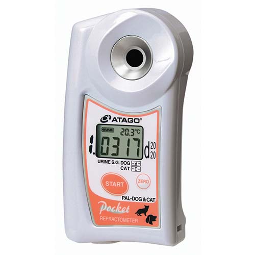 This unit is a urine specific gravity refractometer programmed with the specific scales for both dogs and cats in one unit. Simply place 0.3mL of the sample (urine) on the prism, press the start button and a digital measurement value will be displayed in 3 seconds.This compact-sized, 11cm unit is water resistant so it can be washed under running water after each reading.